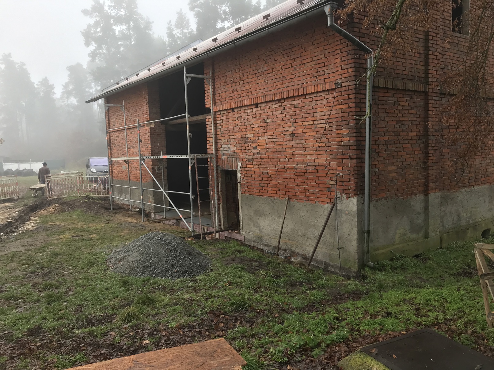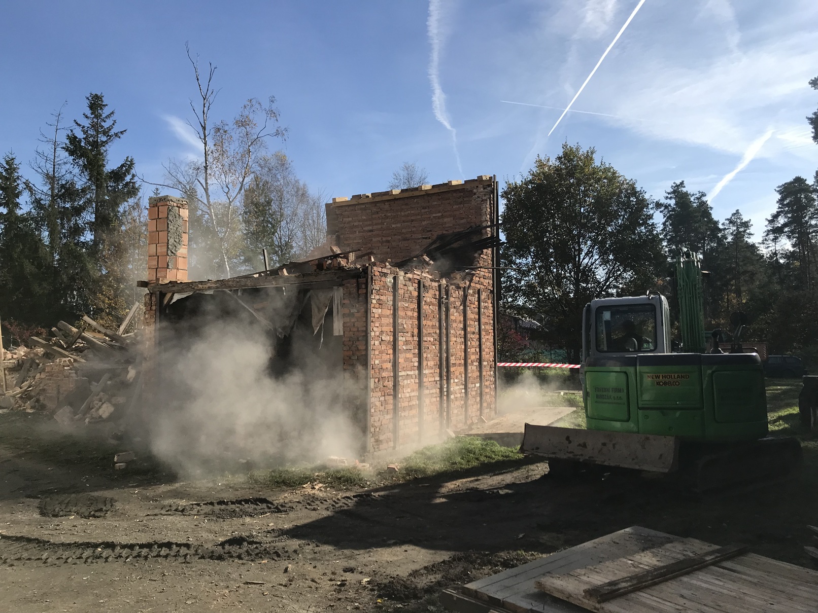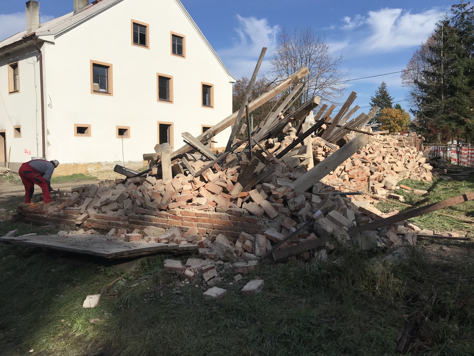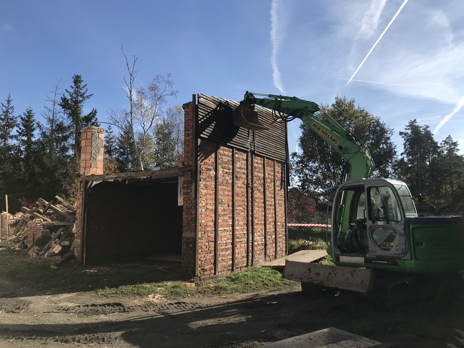 • Demolice a příprava území: Prvním krokem byla odborná demolice staré, staticky nevyhovující stodoly, čímž se uvolnil prostor pro novou infrastrukturu a technické zázemí.